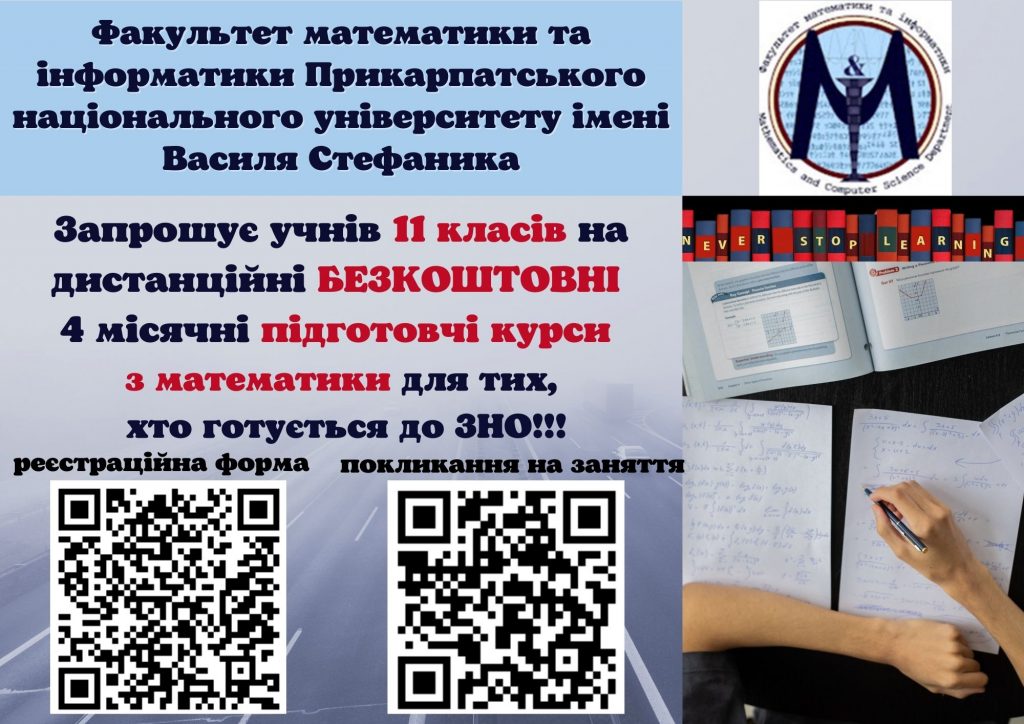 Факультет математики та інформатики Прикарпатського національного університету імені Василя Стефаника Запрошує учнів 10-11 класів на дистанційні БЕЗКОШТОВНІ 4 місячні підготовчі курси з математики для тих, хто готується до ЗНО. Курси ведуться викладачами факультету математики та інформатики. ▪ Заняття проводитимуться щонеділі Читати далі