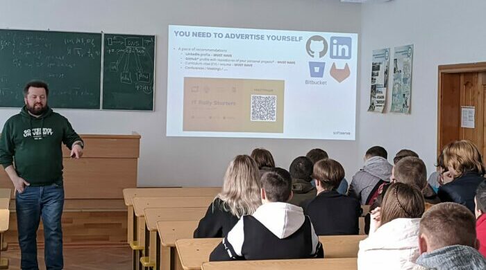 Керівник «Центру розвитку талантів» компанії «SoftServe» в в Івано-Франківській та Закарпатській областях Юрій Безгачнюк провів презентацію на тему «Популярні напрямки роботи в ІТ галузі». Метою доповіді було інформування студентів про сучасні тенденції та перспективи розвитку у сфері інформаційних технологій, а також актуальні тренди щодо можливого працевлаштування. Під час зустрічі спікер розповів про географію офісів, основні напрями діяльності компанії та перелік партнерів «SoftServe». Доповідач звернув увагу звернув увагу на важливість опанування конкретних навичок та компетенцій, які відповідають потребам сучасного ринку ІТ, надав поради щодо того, яким чином варто готувати резюме при поданні заявок на роботу.