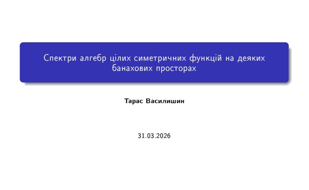 - Проф. Т. В. Василишин презентував дослідження на тему: «Спектри алгебр цілих симетричних функцій на деяких банахових просторах».