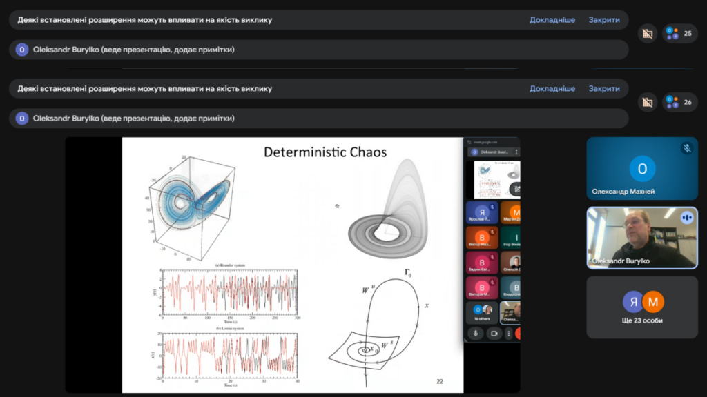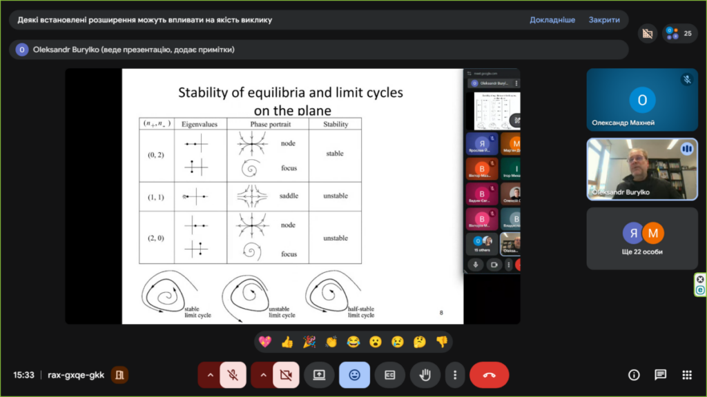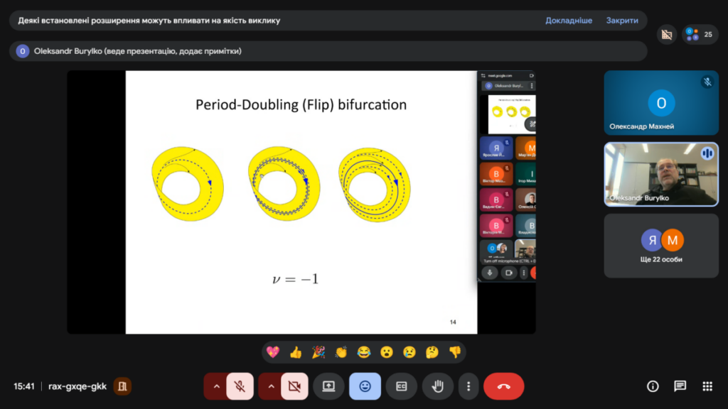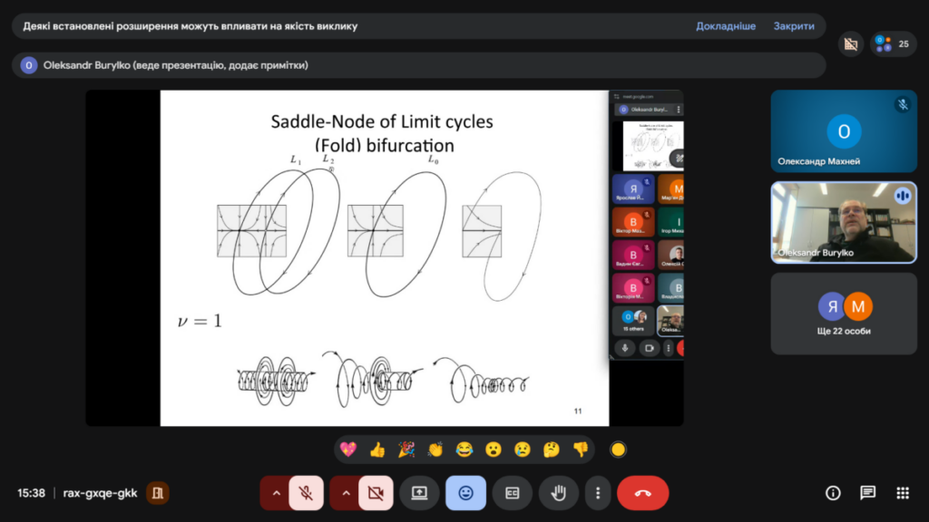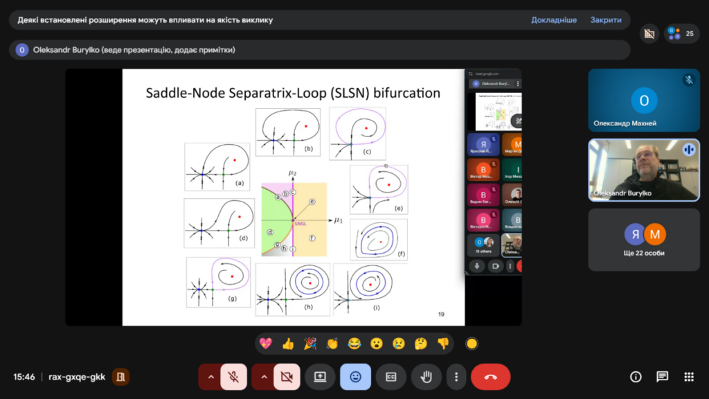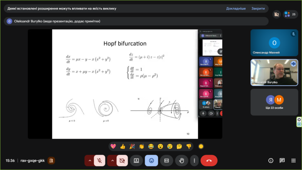 16 квітня відбувся вебінар з колективної динаміки у мережах зв’язаних осциляторів та нейронів. На ньому доктором фізико-математичних наук, старшим дослідником, завідувачем лабораторії складних динамічних систем Інституту математики НАН України Олександром Бурилком була прочитана перша лекція на тему “Теорія біфуркацій та її застосування (біфуркації в картинках)”. Під час лекції було представлено наочний вступ до теорії біфуркацій, де ключові поняття пояснювались з допомогою графічних ілюстрацій, фазових портретів та біфуркаційних діаграм. Особливу увагу було приділено інтерпретації складної поведінки динамічних систем у доступній візуальній формі.